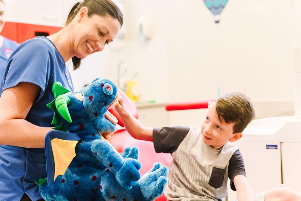 At your child’s first dental visit, we help them get familiar with our team and clinic so they feel comfortable and safe. We may show them their teeth in the mirror, give them a ride in the dental chair and chat with them to get to know them better. This helps our youngest patients feel more relaxed when we start routine care and cleans.